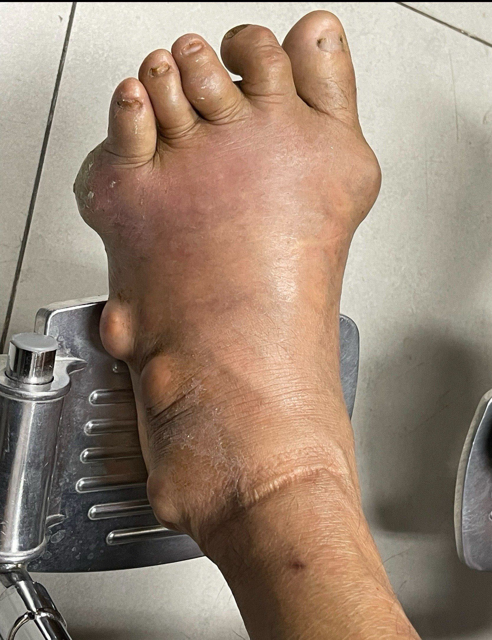 4. หากไม่ได้รับการรักษา ผลึกยูเรตจะสะสมจนกลายเป็นก้อนโทฟัสและทำลายข้ออย่างถาวร